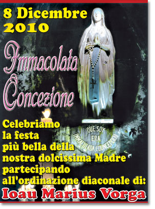 Come già nel 2008 la nostra associazione è lieta di sentirsi Chiesa intorno al Vescovo nel momento importante che un nostro seminarista Ioan Marius Vorga, per l'imposizione delle sue mani sarà ordinato diacono. Per questo contrariamente allo scorso anno ci ritroveremo alle ore 16.30 nella Basilica della Madonna dell'Umiltà per la recita del Rosario e al termine in processione ci porteremo in cattedrale per partecipare alla messa dell'Immacolata durante la quale il Vescovo procederà all'ordinazione.